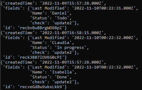 这是来自airtable的3条记录,我想在python中创建一个for循环(如果'check‘中的值是Update2 --做某事,做其他事情)