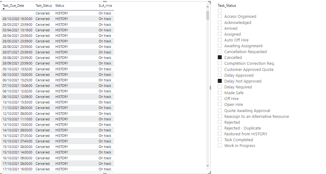 )我想编写Dax查询,以跟踪SLA是否丢失。如果任务到期日已经过去,任务状态被“取消”或“任务完成”,SLA缺失应该说“完成”,否则说“被破坏”。如果日期是在未来,SLA错过应该说“在轨道上”