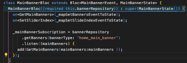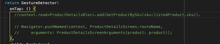 例如,如果我有一个名为ProductDetailsBloc的区域,用于控制产品详细信息页中的产品详细信息小部件,则其事件包含一个名为GetProductBySku的事件,该事件用于从防火墙获取产品并在state(ProductDetailsState).中设置产品。