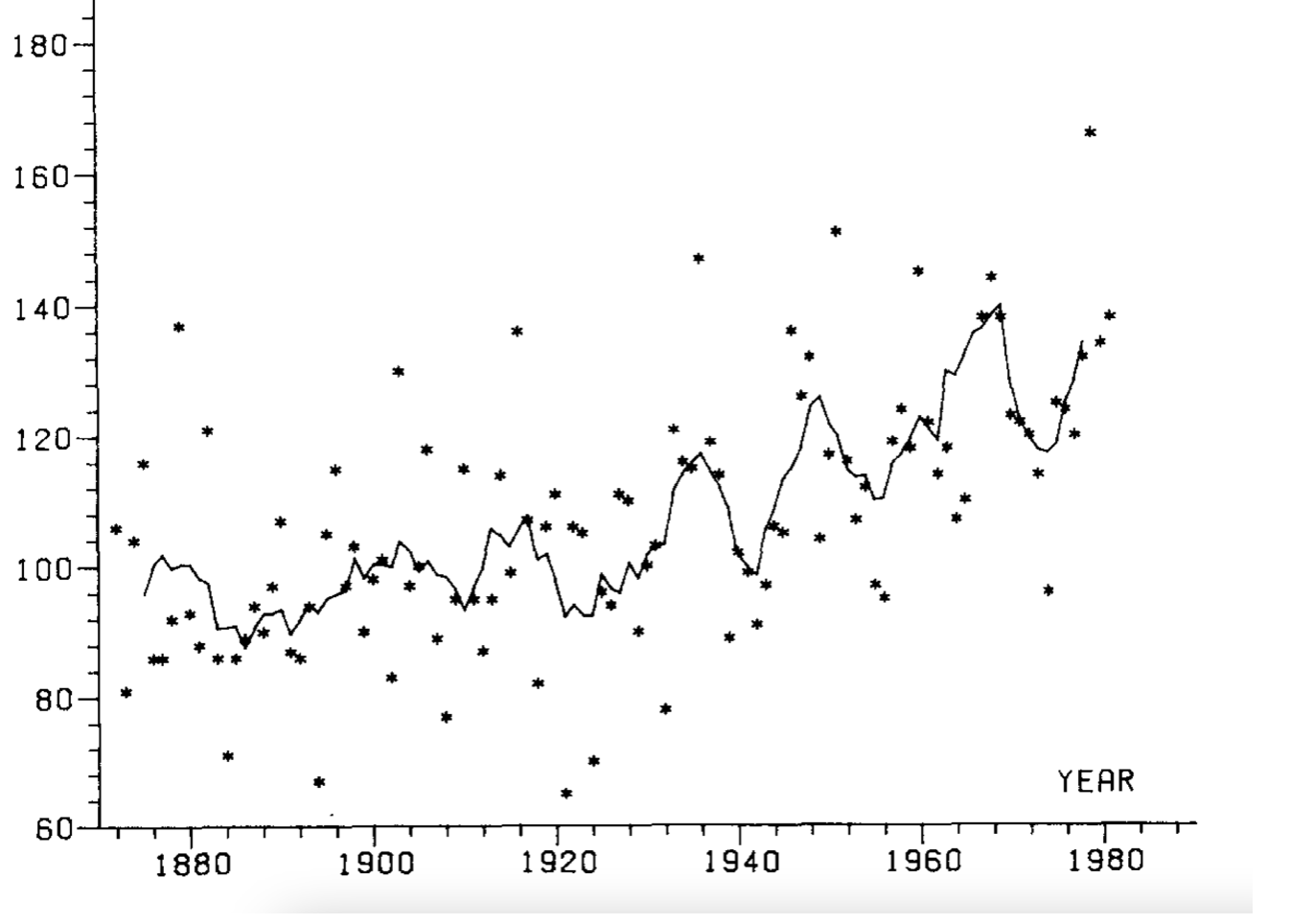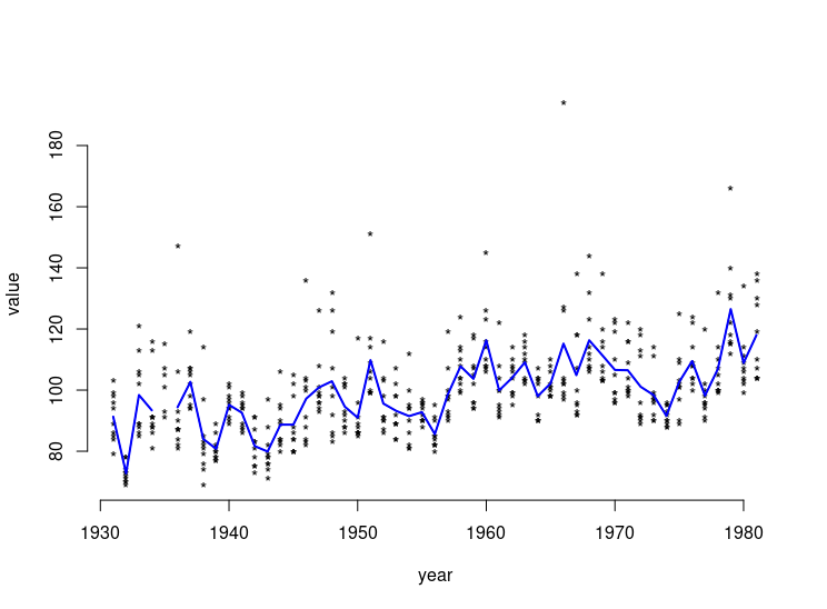 plot(value ~ year, data = df_long, bty = 'n', type = 'p', pch = '*')