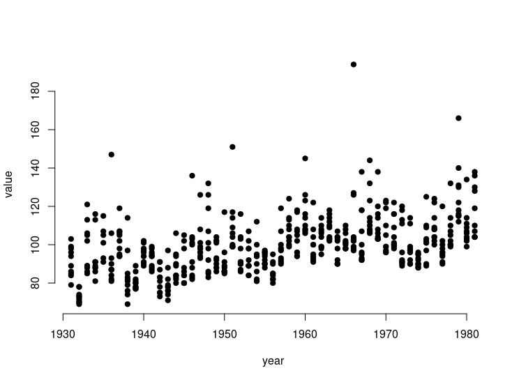 plot(value ~ Year, data = df_long, bty = 'n', type = 'p', pch = 19) 产出: