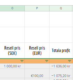 我的目标是,当我转售pris ( SEK )值时,我应该只使用=SUM(O6-I6) ( Totala profit ),但是如果我有欧元,那么我想用瑞典克朗将欧元兑换成今天的货币,并计算它的总利润,这意味着类似于(100€ * swedish currency) - value in totala profit e.g. 1000.。
