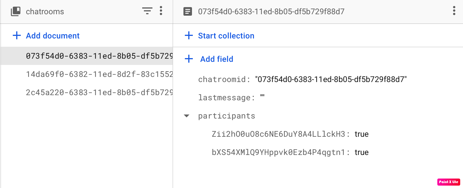 聊天室集合有一些字段,如id、最后一条消息和一张地图,其中的键是聊天成员的userid和bool,用于指示