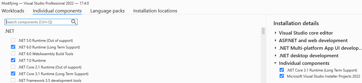 我从VisualStudio2022安装程序安装了.NET Core3.1Runtime:-