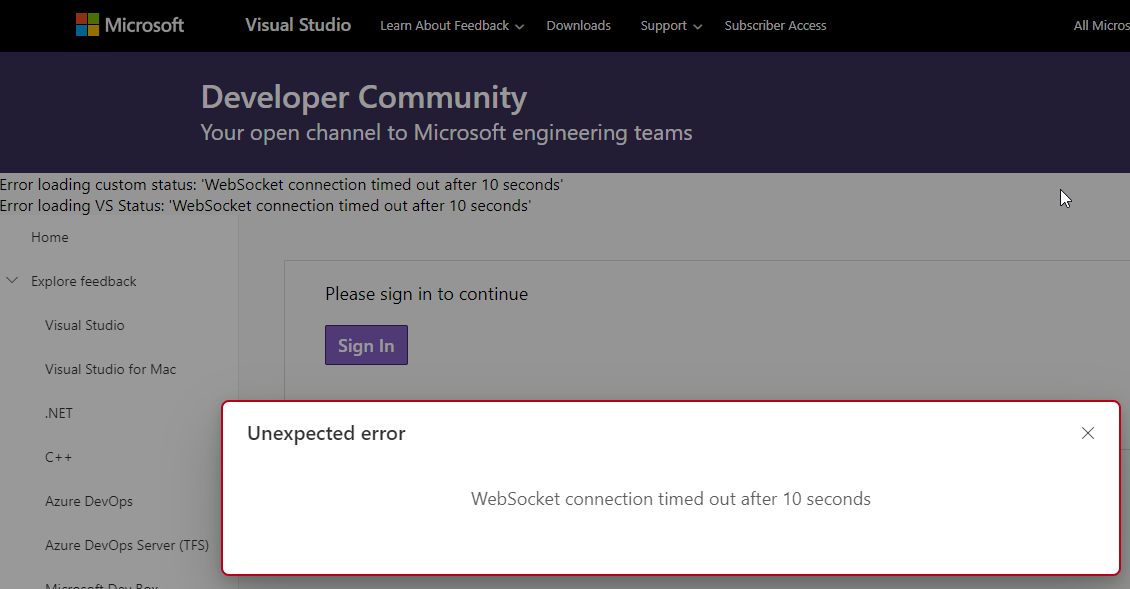 我试图通过VS反馈向微软的VS Studio错误反馈,但是他们似乎不仅在桌面Sowftare上有问题.