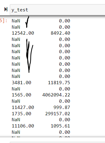 )但是当我查看y_test时,它看起来如下所示,NaNs如下所示。不知道是什么问题。是否缺少索引号或其他问题?