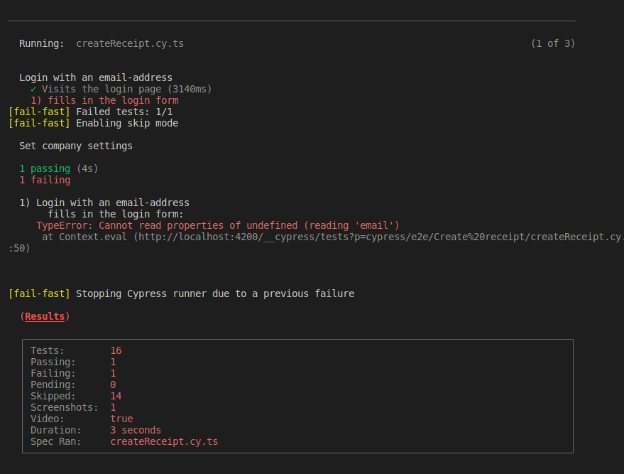 在我的类型记录Cypress配置中,我使用的是cypress-fail-fast插件> https://github.com/javierbrea/cypress-fail-fast,但它似乎不起作用。
