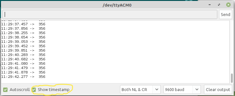 Arduino串行监视器将时间值加到从Arduino接收的每一行。如果将行从Serial复制到Excel,只需直接在Excel中添加带有日期的列。