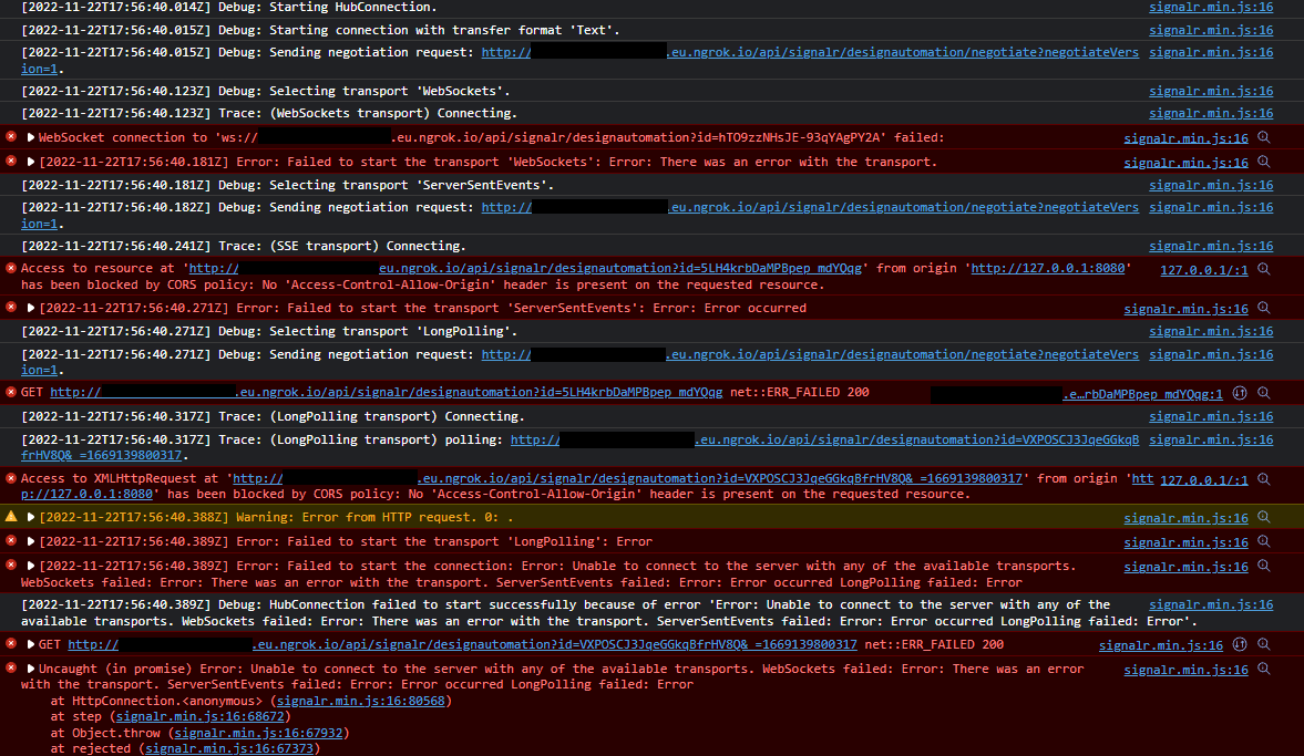 [2022-11-17T10:21:02.093Z] Debug: HubConnection failed to start successfully because of error 'Error: Unable to connect to the server with any of the available transports. WebSockets failed: Error: There was an error with the transport. ServerSentEvents failed: Error: Error occurred LongPolling failed: Error'.