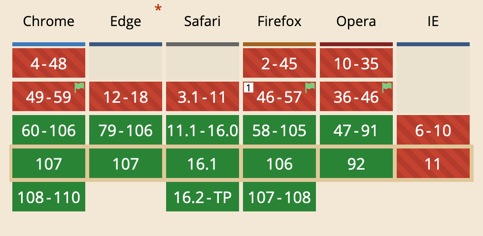 您可以始终使用此站点来检查是否支持标记,它们都是最新的。您只需输入标记,并查看哪些浏览器支持它。