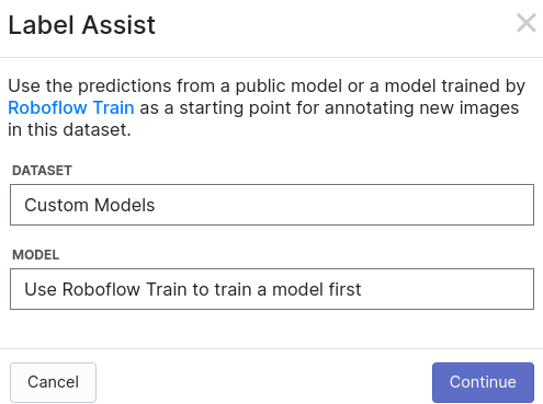 使用您生成的dataset版本在YOLOv5中进行培训以使用Roboflow列车:https://docs.roboflow.com/train -一旦您的培训工作完成,您将可以访问模型辅助标记(标签辅助):https://docs.roboflow.com/annotate/model-assisted-labeling
