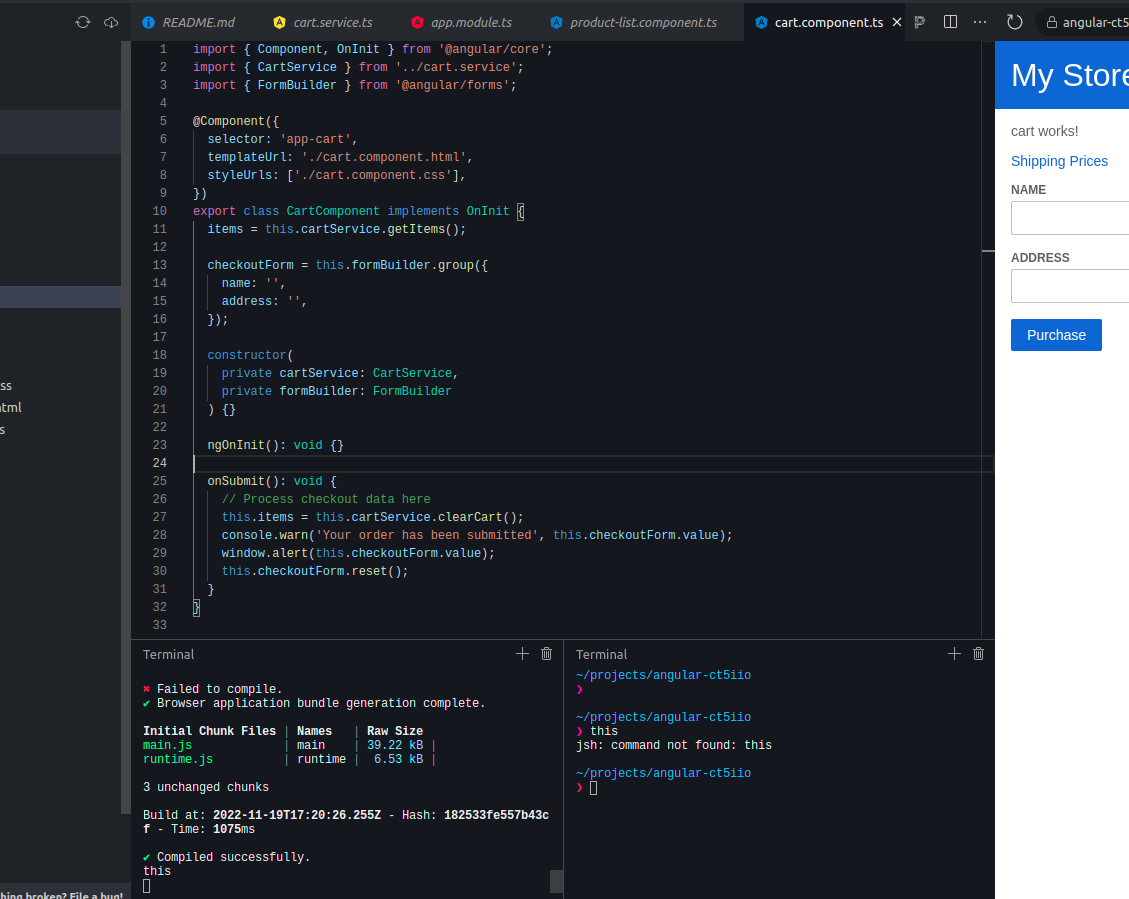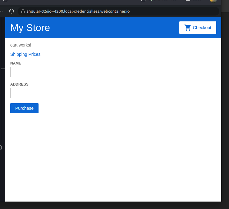 在角的“开始/尝试它/使用表单作为用户输入”的末尾,我们被要求“打开控制台,查看包含您提交的名称和地址的对象”。但我只有一个运行应用程序的终端,还有一个经典的终端可供我使用。