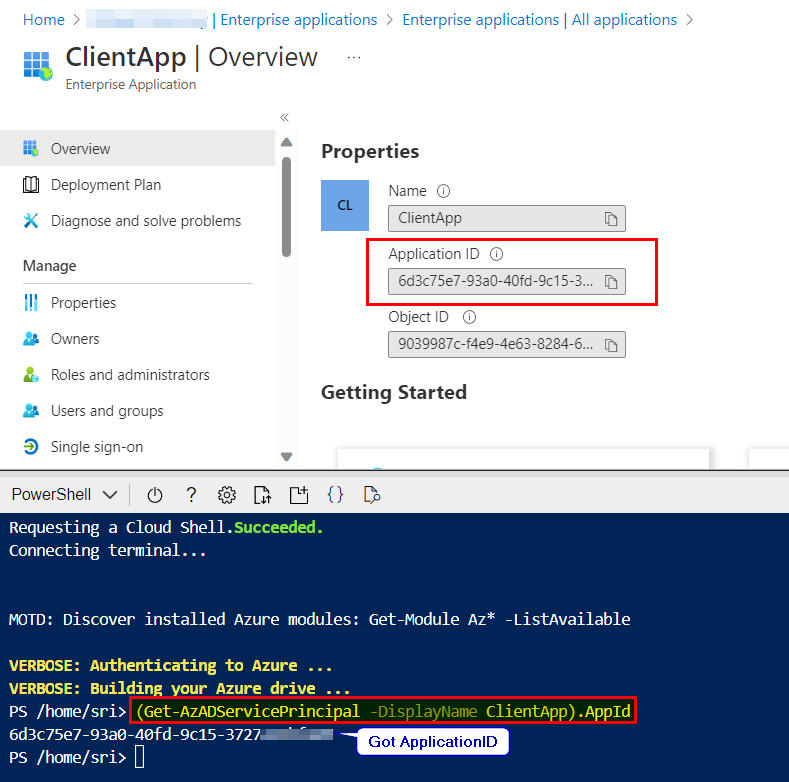我有一个名为ClientApp的服务主体,并成功地获得了它的应用程序ID,如下所示: