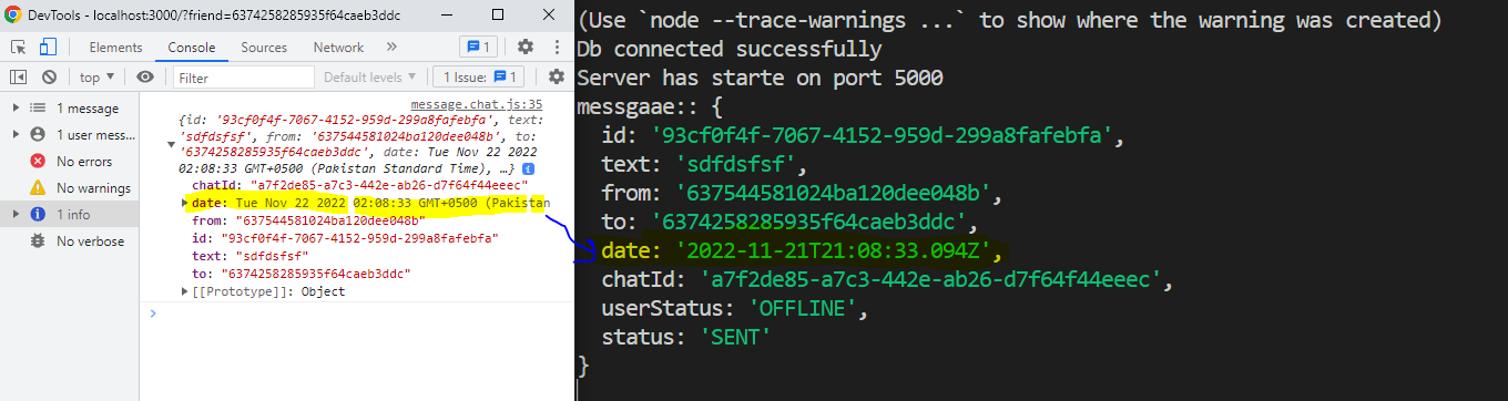 所以问题不在后端,而是在前端,JSON.stringify是问题所在,它正在更改日期,而不是发送原始日期对象,我正在将日期转换为本地字符串,并将其发送出去,这很好。