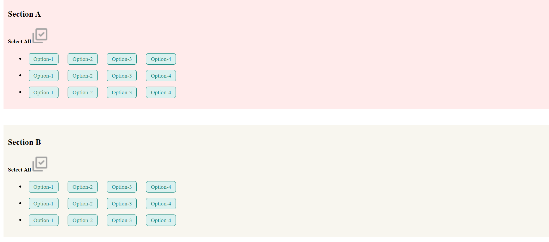 你好,当我点击select all时,我是选中框,现在它正在选择页面上的所有框,但我必须使它具有特定的节,意思是当我单击“选择所有”的A节。它应该选择所有的A节的框,而不是B或C节,如何使我的选择节具体。请检查图像以更好地理解