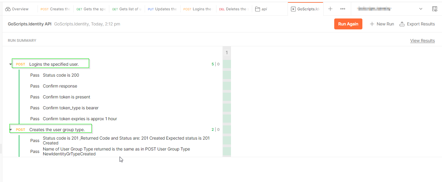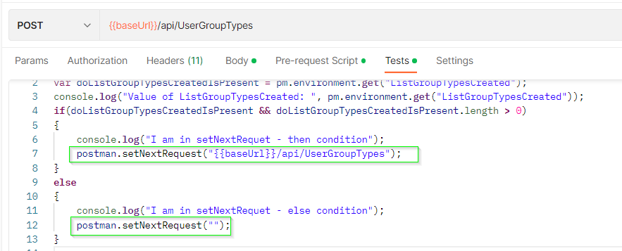 我的第二个API (POST创建用户组类型)。在测试中包含postman.setNextRequest()方法。