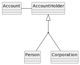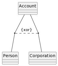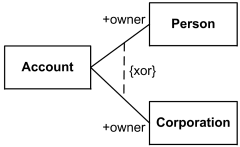 您可以通过关联两个元素并创建一对相同的元素来实现这一点,例如,(Account, Person).This创建一个包含两个与点相关的线段的复合元素。然后,可以将这两对...关联起来,以获得虚线,并通过添加尾随: {xor}来命名这种关系。