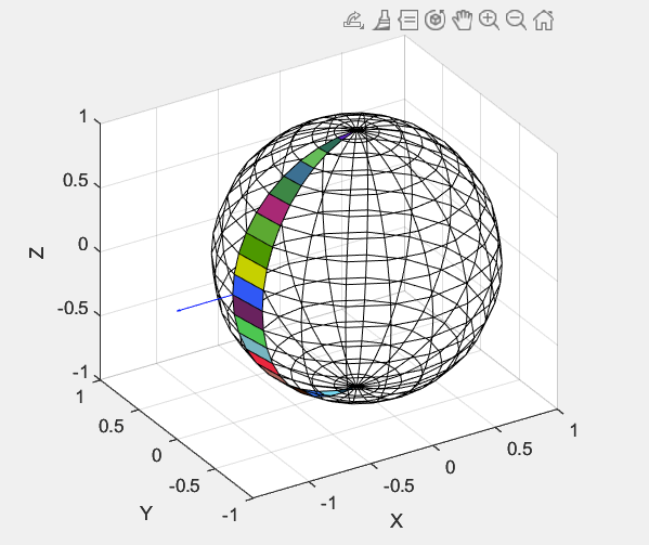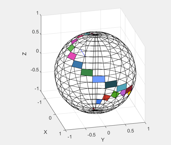 我试图创建一个球面直方图,但是我的数据点是纬度和经度值,所以我需要能够根据球的位置来着色一个给定的单元格区域,而不是随机地遍历索引。对于这里跳过某些方位和高度的问题,我已经得到了类似的答案:Coloring sections of sphere, some regions end up with unassigned colors,然而,这有一个方位角区段的空白条,而且排序也不像预期的那样有序。