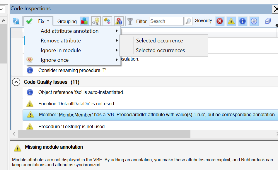 我刚刚开始在我的VBA应用程序中使用Rubber鸭子。我在这里看到了一篇关于添加属性的很棒的文章:How to set the Attribute VB_PredeclaredId using RubberDuck '@PredeclaredID