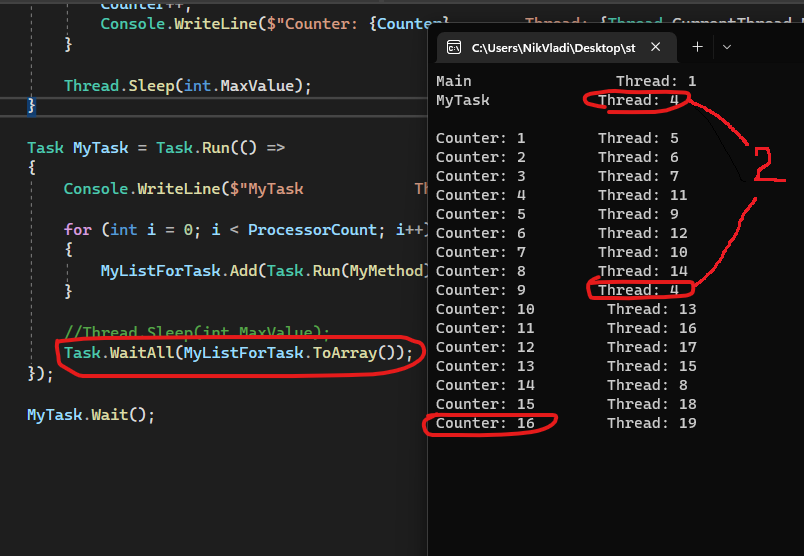 问题.为什么Task.WaitAll不阻止在本例中执行它的线程,而不像Thread.Sleep或while (true)?有人能一步一步地解释线程4中的两个任务的代码在使用Task.WaitAll时是如何工作的吗?为什么任务MyTask运行的线程也被任务条件B16使用?