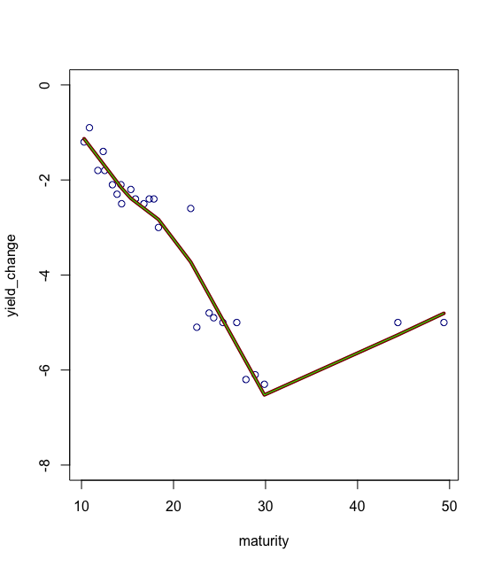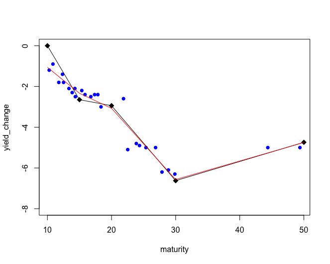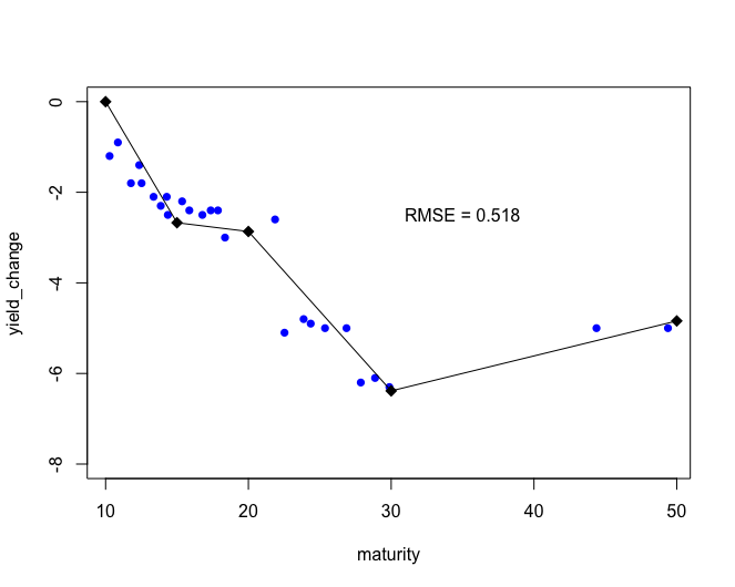 这是它的代码和图形结果。我的约束是必须在坐标(到期日= 10和yield_change = 0)处设置起始点,并且断点必须在15、20和30处。(我希望模型从成熟度10开始,在成熟度50时结束)。