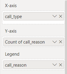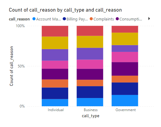 我对power bi相当陌生,我正在尝试创建一个由两列组成的堆叠条形图(一列包含类型:个人、企业和政府。第二列包含新的连接,投诉等)我想要创建一个堆叠条形图的类型在x轴和原因在y轴。所以我所做的是:
