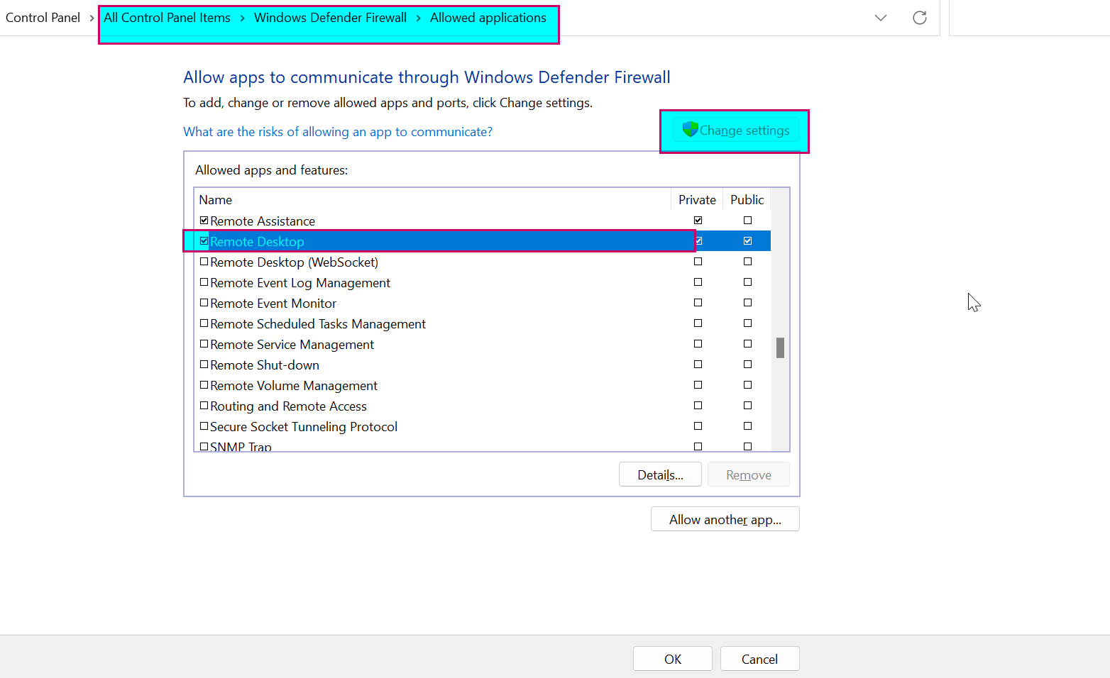 点击Windows按钮,搜索“允许应用程序通过windows防火墙”,并更改屏幕截图中提到的设置。