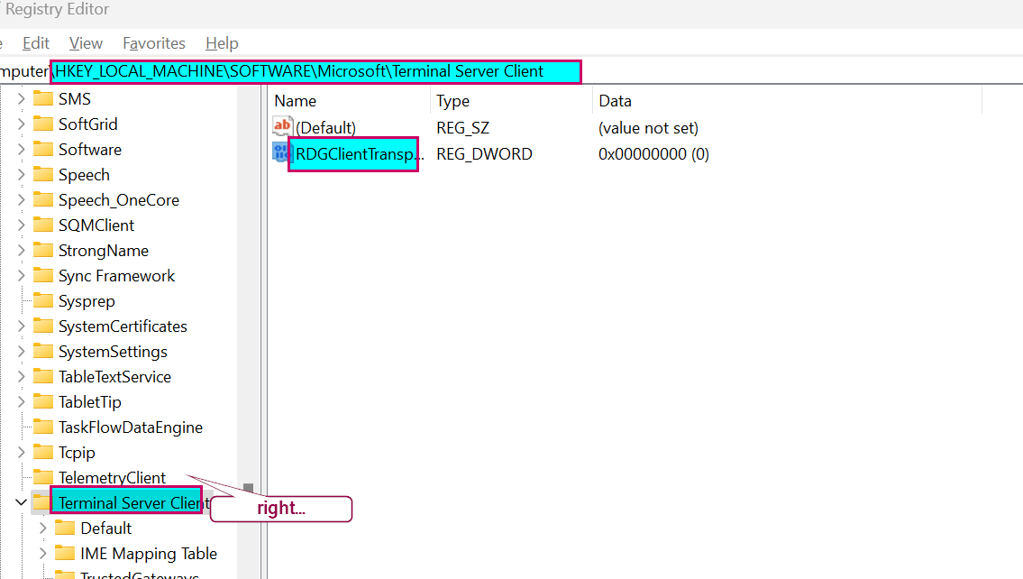 3)。添加RDGCLIENT传输键,按windows +R并键入regedit并输入