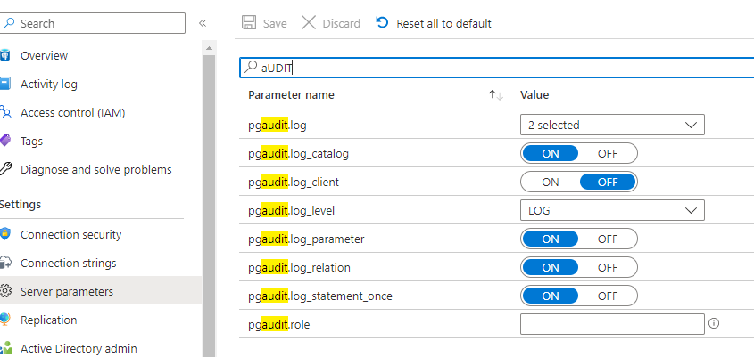我正在尝试在Azure单一服务器中启用pgaudit。我遵循了Microsoft提供的说明和Postgres的文档。