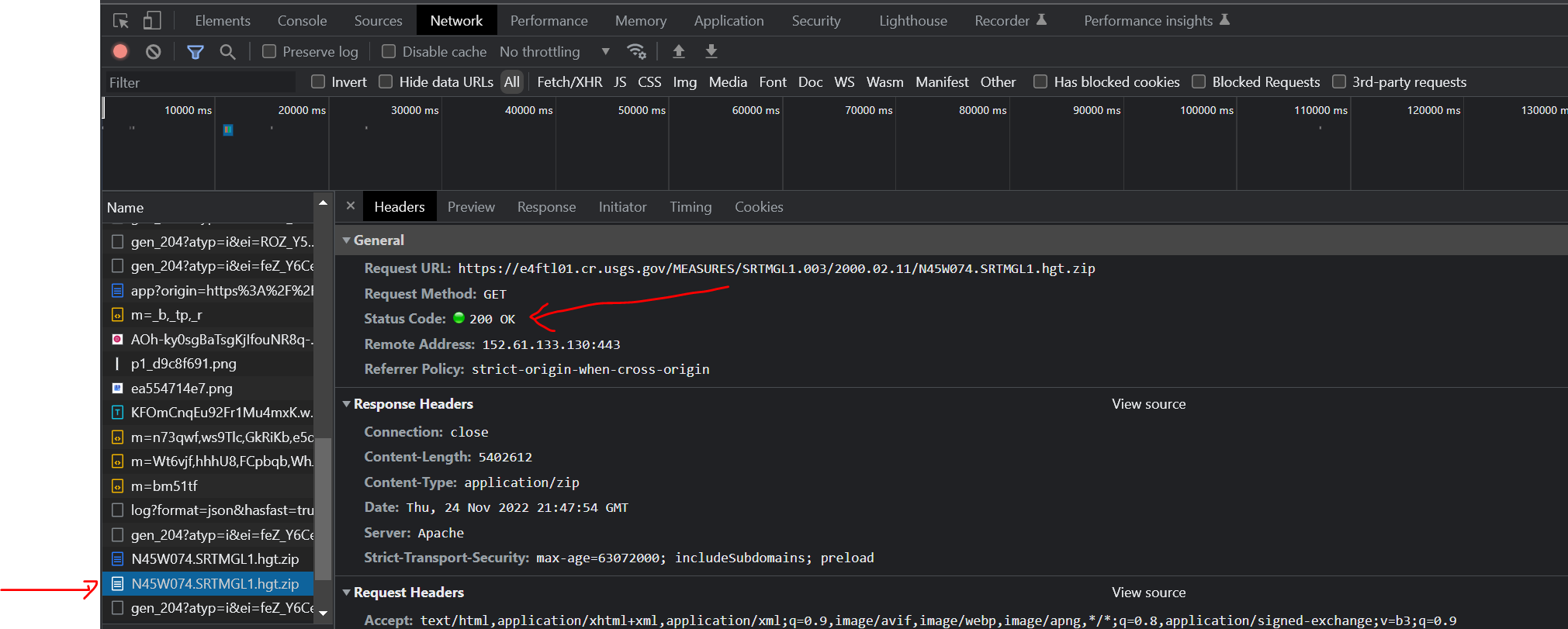 http://e4ftl01.cr.usgs.gov/MEASURES/SRTMGL1.003/2000.02.11/N45W074.SRTMGL1.hgt.zip如果您将其粘贴到浏览器并点击enter,它将下载.zip文件夹。