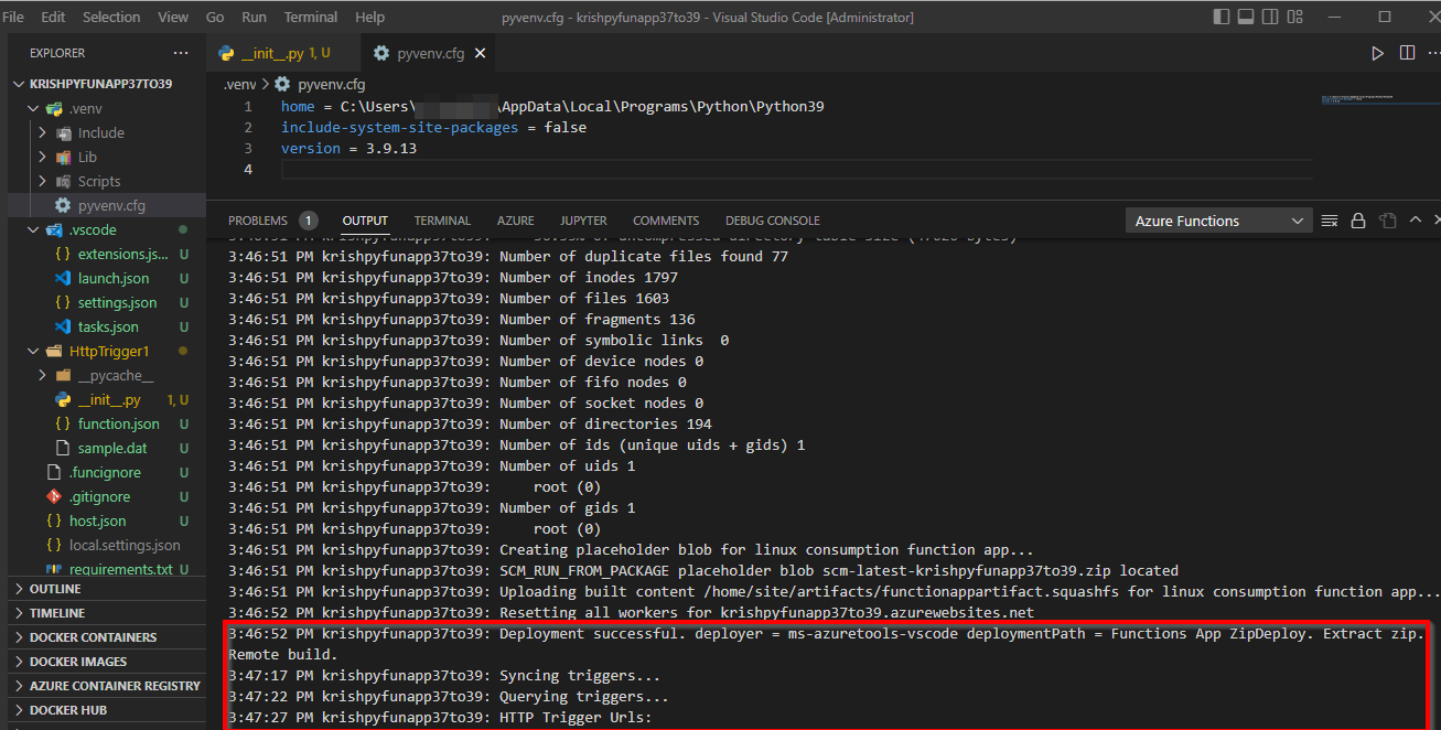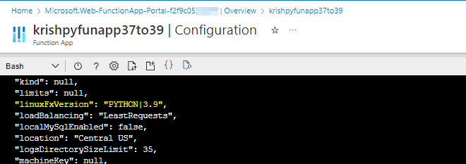 我在蔚蓝门户中有一个函数应用程序( python ),它在python版本3.7中。函数应用程序的FUNCTIONS_EXTENSION_VERSION是~3。当我从VS代码中部署函数python以更新门户中的函数时,我能够部署并且更新反映在azure门户中。