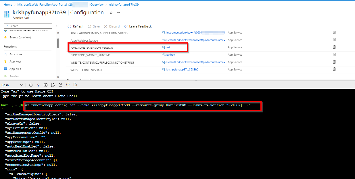 步骤1:使用cmdlet将门户中的Azure函数应用程序的FUNCTIONS_EXTENSION_VERSION更新为4和Python: