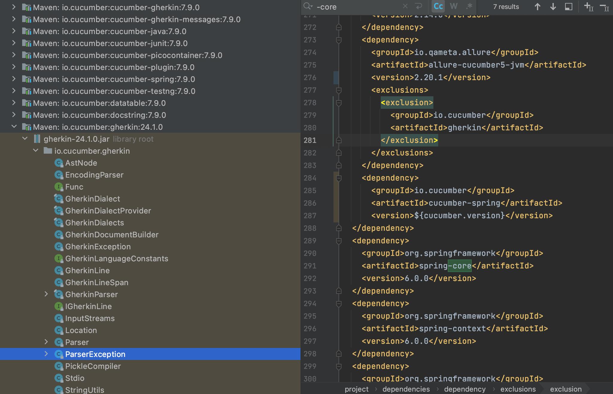 当我运行测试时,我得到以下错误:[ERROR] TestRunner>AbstractTestNGCucumberTests.setUpClass:27 ? Cucumber java.lang.NoClassDefFoundError: gherkin/ParserException,我附加了我的依赖树图,还在我的库中附加了gherkin/parserexception类