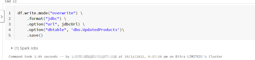 下面的吡火花代码将将数据复制到Azure SQL数据库中的默认dbo架构。