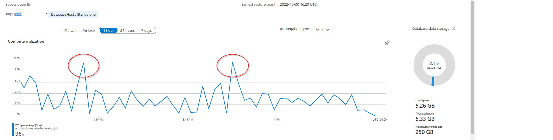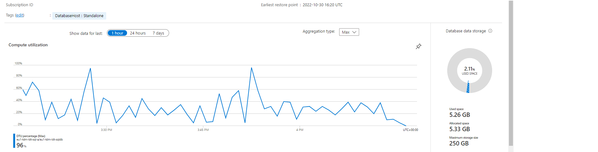 运行负载测试时,的DTU达到100% (标准S2: 50个DTU)。