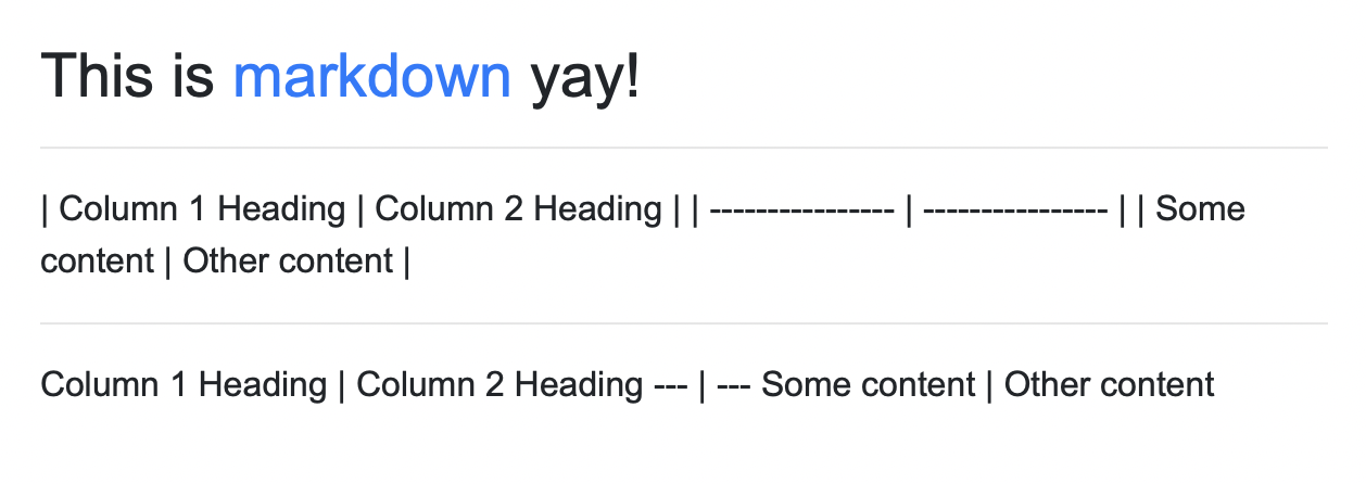 Some content | Other content结果是这样的。第一行和横向规则只是确认内容实际上正在被翻译成Markdown--除了我真正关心的东西,表。
