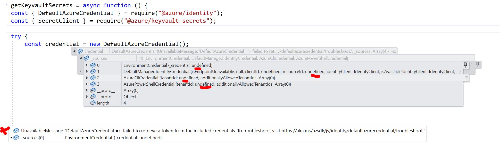 我猜它通过AzureCLI获取凭据,尽管它在实例化凭据时是不可见的,这正是我所期望的。但从下面的图片中可以看到,这一切都是没有定义的。