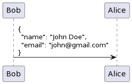 Bob -> Alice : {\n "name": "John Doe",\n "email": "john@gmail.com"\n}