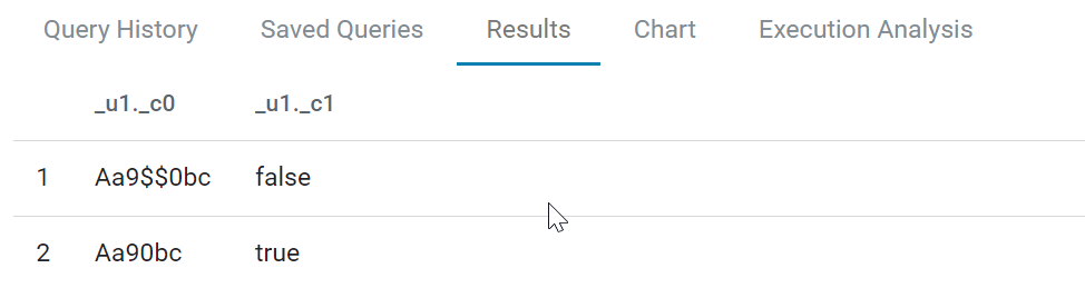 我运行了一个简单的select语句来检查字符串是否有字母数字或不使用regex,这是输出。select 'Aa90$$bc' ,'Aa90$$bc' rlike '^[A-Za-z0-9]+$'