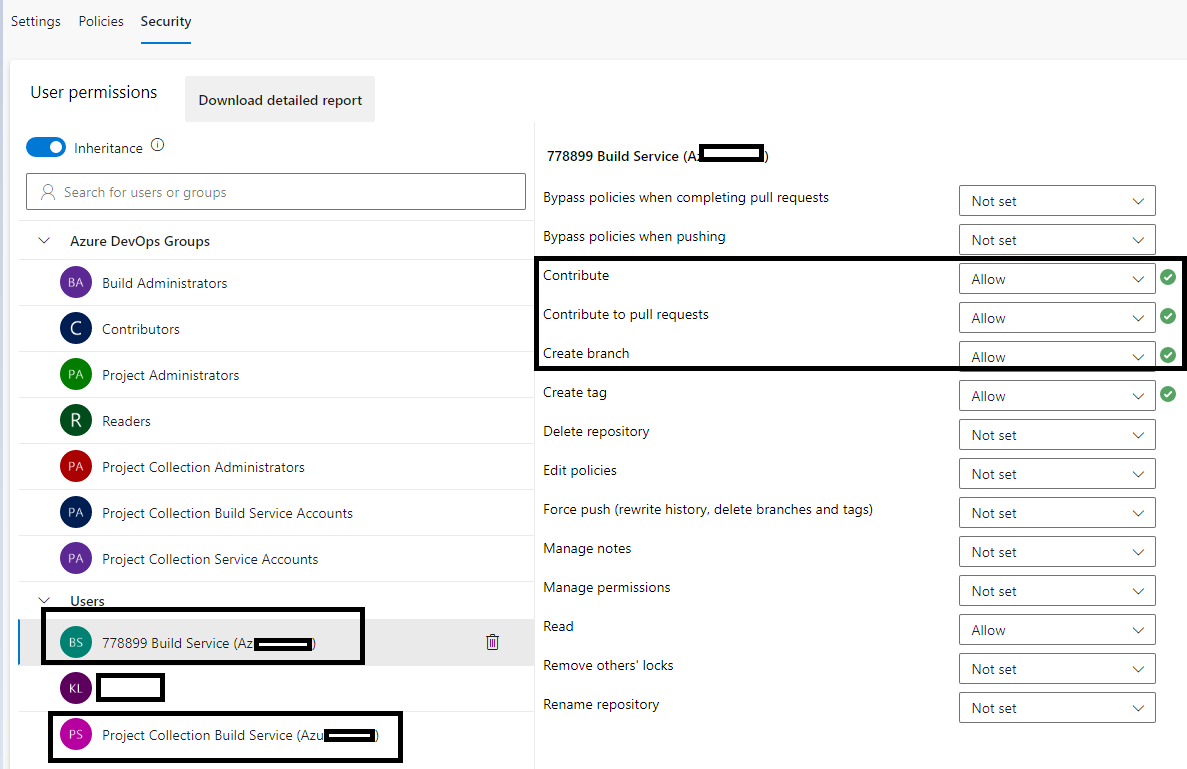 您可以导航到项目设置、->存储库、->目标回购、->安全,并向两个构建服务帐户授予贡献权限。