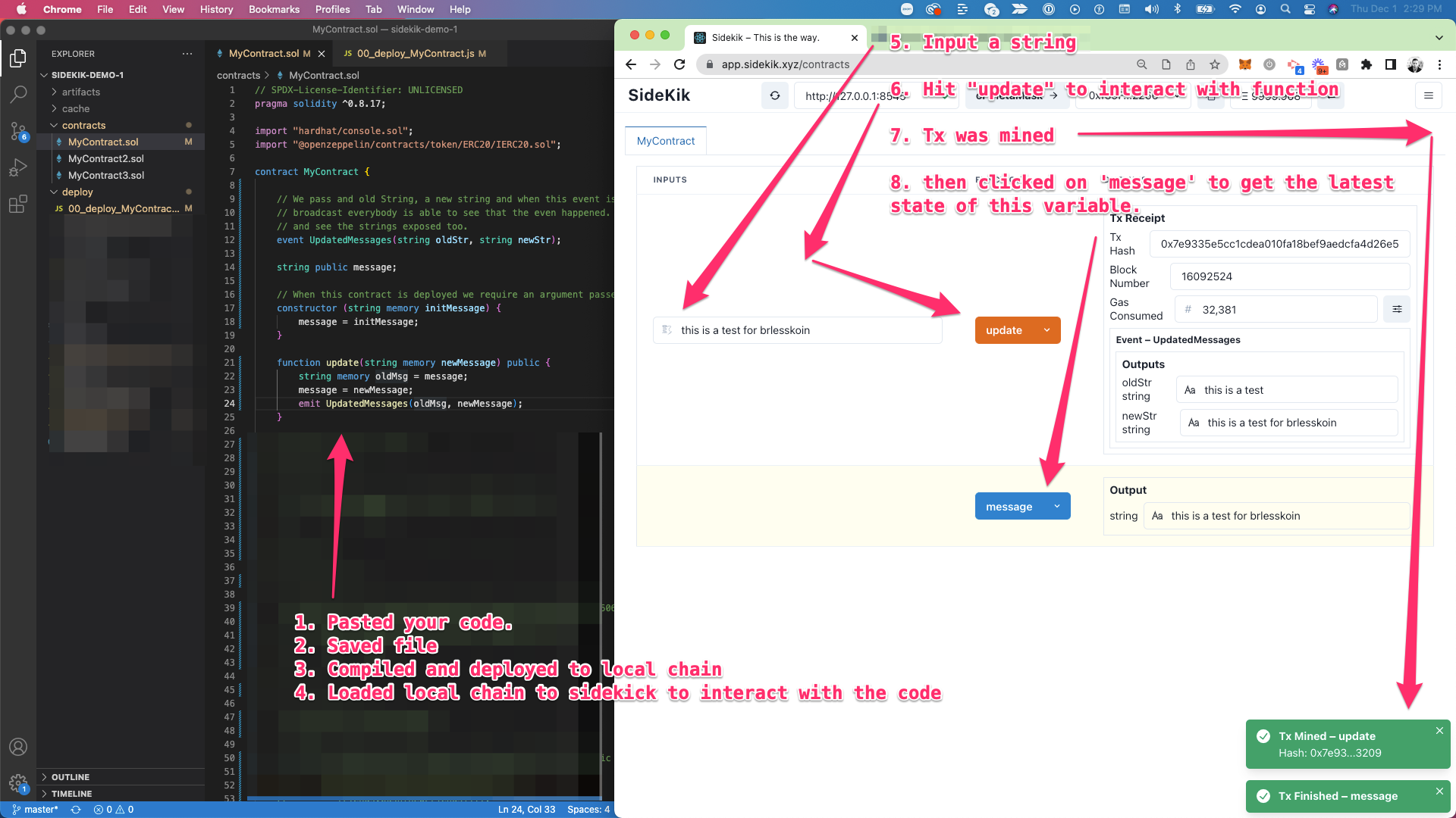 我使用该设置作为一个干净的板,启动我的本地主机链,然后连接到我的sidekik接口来测试函数。你的代码很好用。这里的例子: