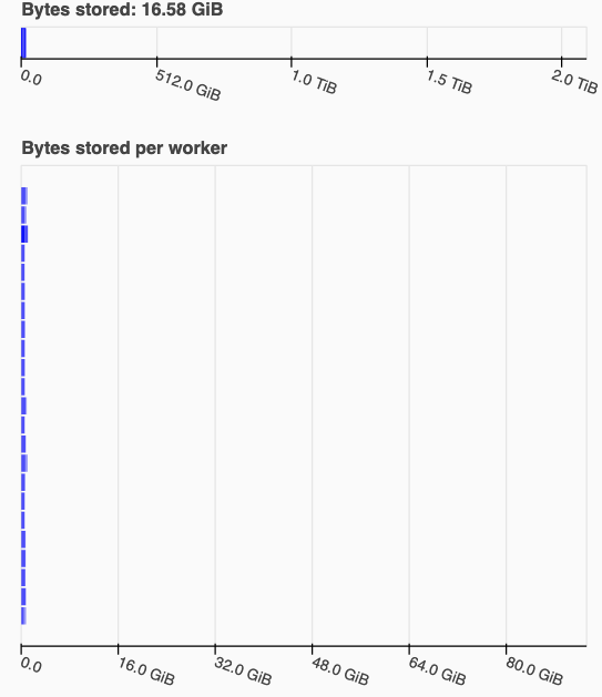 我有一个dask集群,其中有几个工作人员,每个工作人员的内存为93 GiB = 100 GB,整个集群的内存超过2 TiB (见下图)。当我看到仪表板时,我的工作运行,它波动了一点,但总是看上去像在图片中显示的东西,即没有在内存限制附近。然后,其中一名工人将因内存不足而死亡.我真正感到困惑的是,它是如何发生的,为什么它在仪表板上根本没有显示出来?(请注意,我的dask版本足够新,它将非托管内存显示为每个工作人员的浅色)。