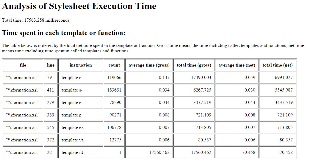如果还有人对此感兴趣,那么Saxon有一个性能分析,它的功能可以让您了解每个模板以及使用它们的次数(这对优化非常有用)。