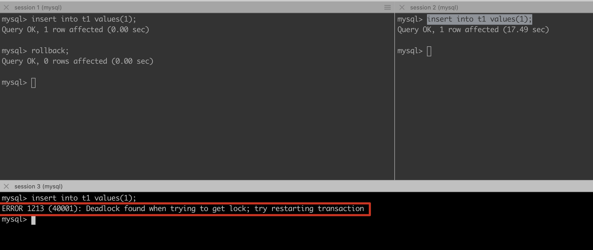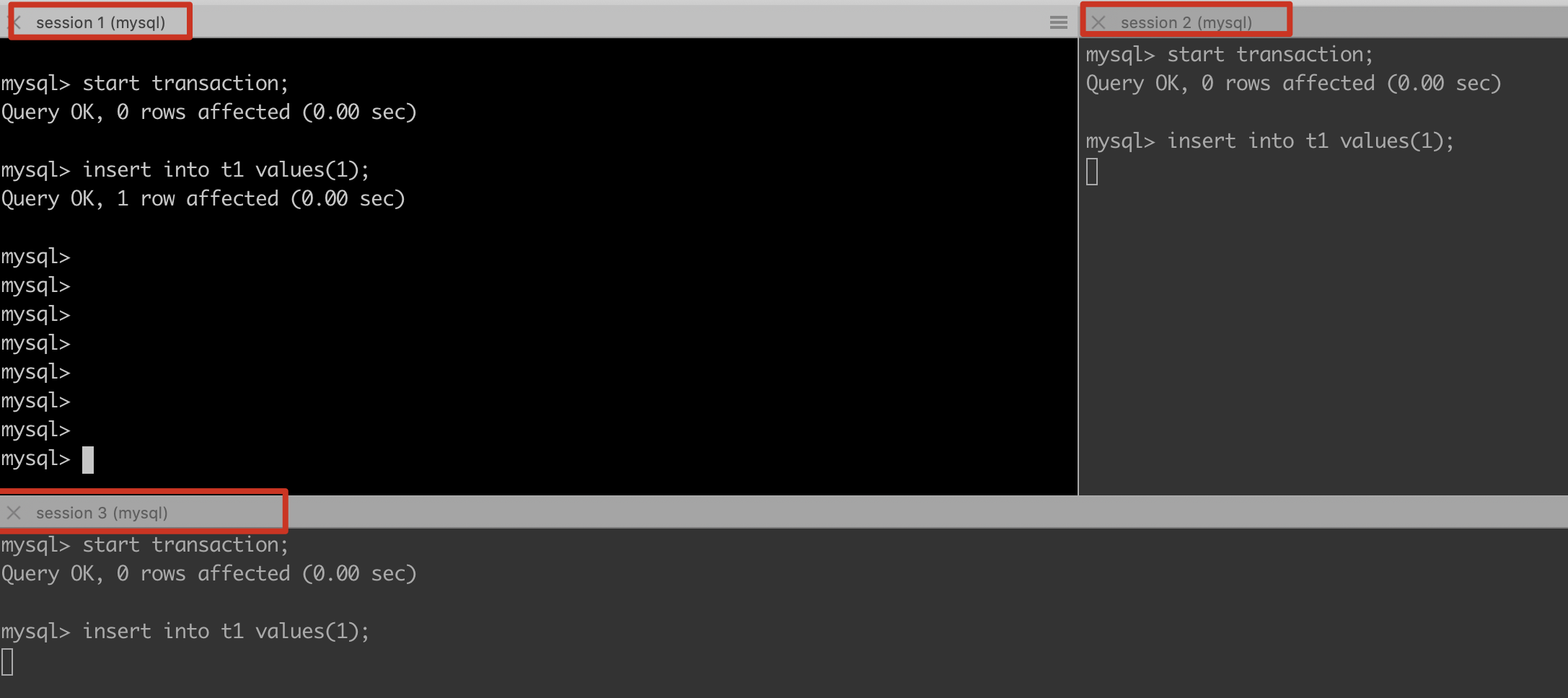 insert into t1 values(1);session3: --------------- operation 3