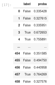 pd.DataFrame({"label": pred, "proba": proba[:,1]})如下: