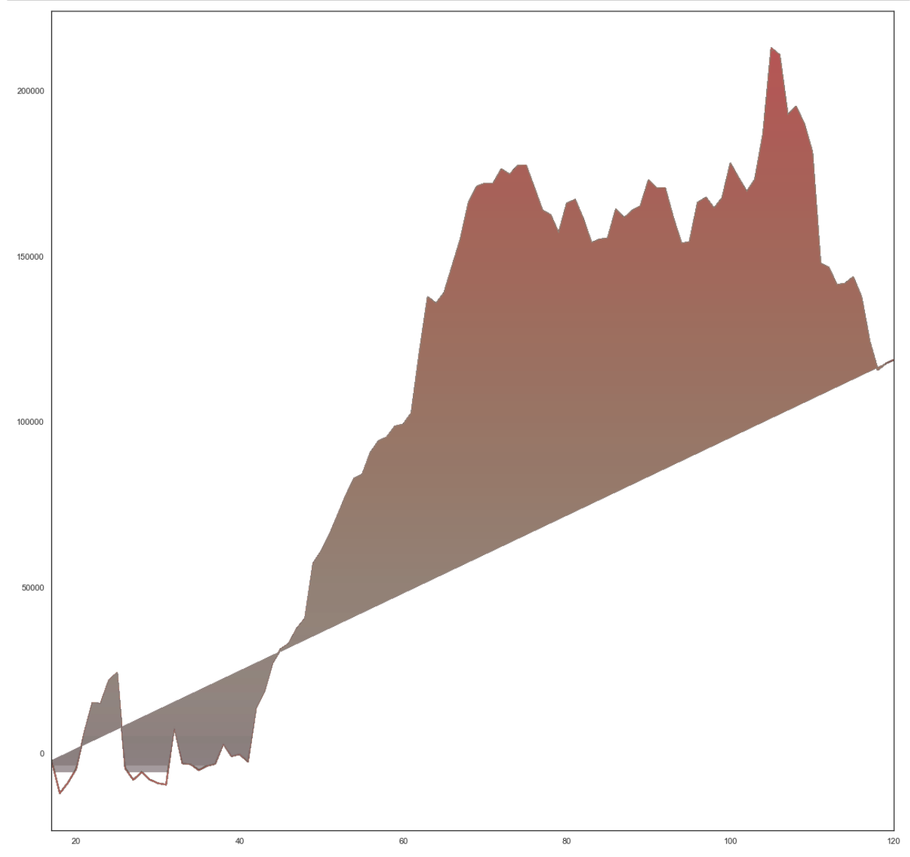 我一直在用Is it possible to get color gradients under curve in matplotlib?作为参考(你可以看到相似之处,但我无法在我的生活中弄清楚如何在Y轴上把阴影一直推到0,因为某些原因我找不到,它有一条向上倾斜的直线切断阴影,我在我的数据中找不到任何东西来说明为什么会这样做。