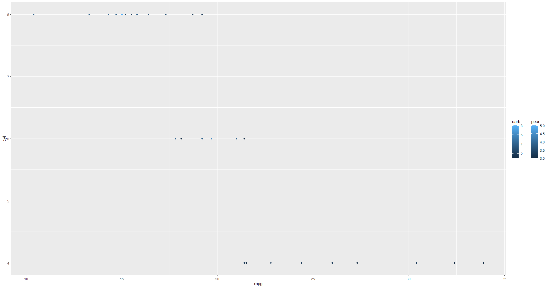 ggplot(mtcars, aes(x = mpg, y = cyl)) +