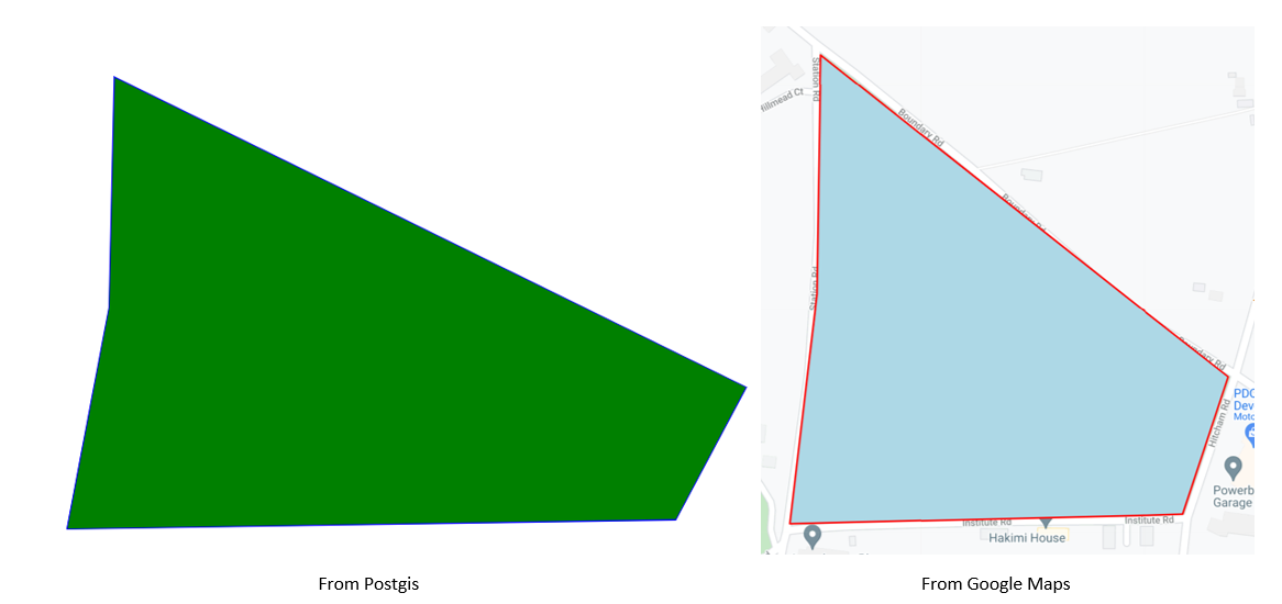 接下来,我尝试使用Postgis复制多边形形状,并创建其中的SVG,但这是我遇到问题的地方。如您所见,绿色多边形具有相同的基本形状,但与谷歌地图的输出相比,它已经被水平拉伸。