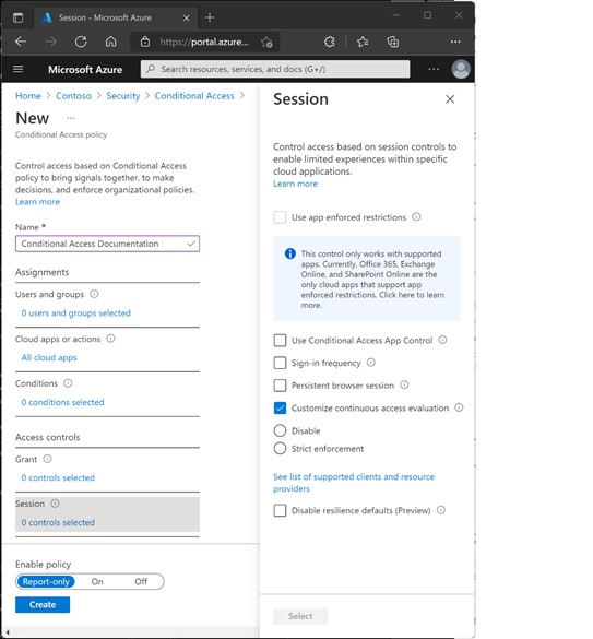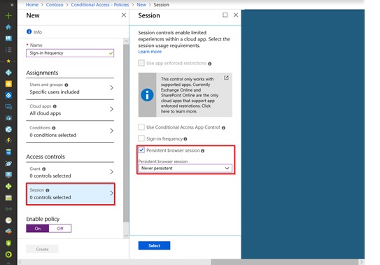 此外,确保在条件访问策略中的某些设置,如登录频率控制、持久浏览器会话控制等,在您的策略中根据您的要求正确设置或不启用。这些设置的配置请参阅以下参考图像:-