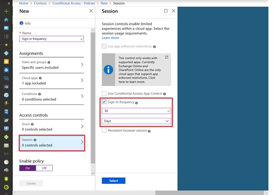 因此,要检查Azure AD中条件访问的身份验证会话控件,请检查在Security -->条件访问中配置的会话控制设置,如下所示,这些设置定义刷新令牌和会话行为:-
